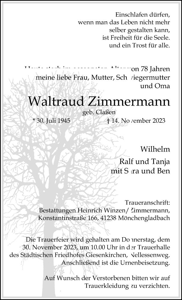 Hier finden Sie alle Traueranzeigen aus der Zeitung, die bisher für Waltraud Zimmermann erschienen sind. Weitere Traueranzeigen, die in der Zeitung erscheinen, werden hier ebenfalls aufgelistet