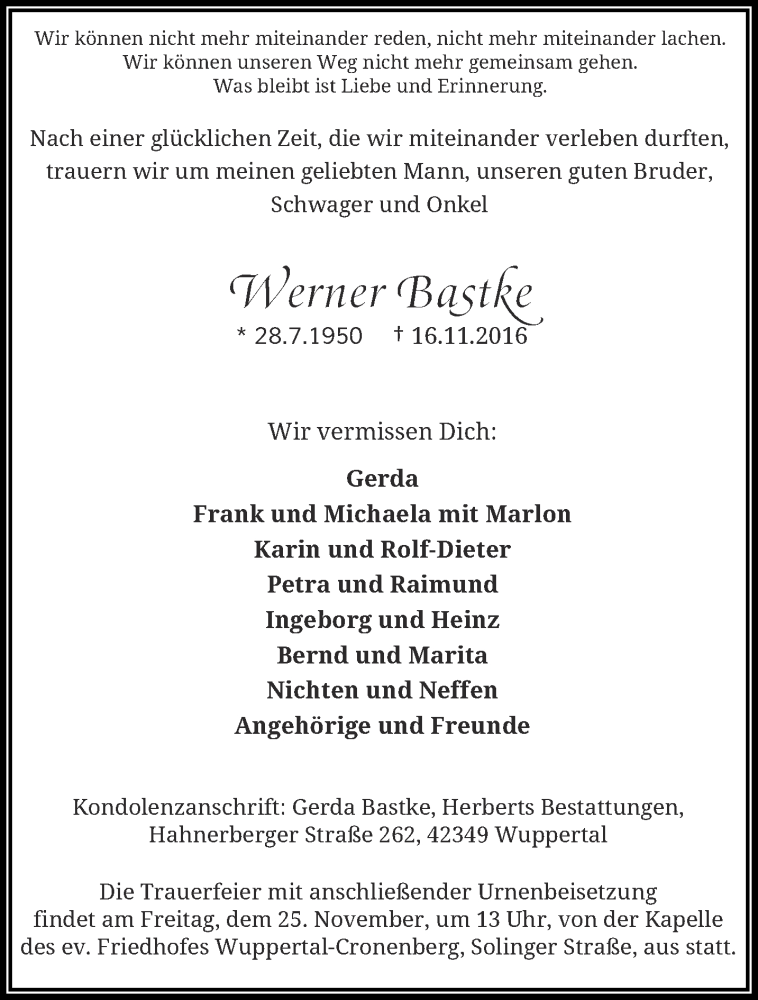 Hier finden Sie alle Traueranzeigen aus der Zeitung, die bisher für Werner Bastke erschienen sind. Weitere Traueranzeigen, die in der Zeitung erscheinen, werden hier ebenfalls aufgelistet
