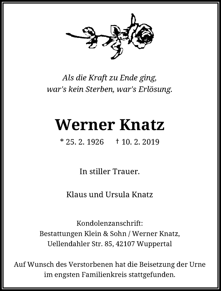 Hier finden Sie alle Traueranzeigen aus der Zeitung, die bisher für Werner Knatz erschienen sind. Weitere Traueranzeigen, die in der Zeitung erscheinen, werden hier ebenfalls aufgelistet