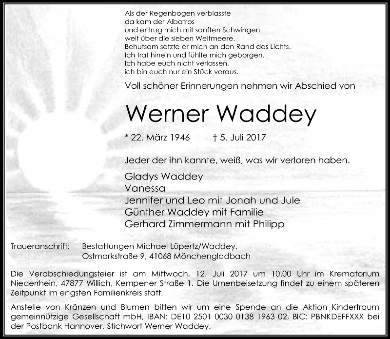 Hier finden Sie alle Traueranzeigen aus der Zeitung, die bisher für Werner Waddey erschienen sind. Weitere Traueranzeigen, die in der Zeitung erscheinen, werden hier ebenfalls aufgelistet