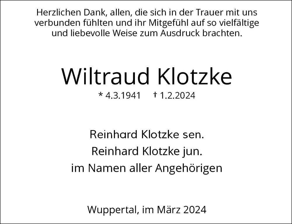 Hier finden Sie alle Traueranzeigen aus der Zeitung, die bisher für Wiltraud Klotzke erschienen sind. Weitere Traueranzeigen, die in der Zeitung erscheinen, werden hier ebenfalls aufgelistet