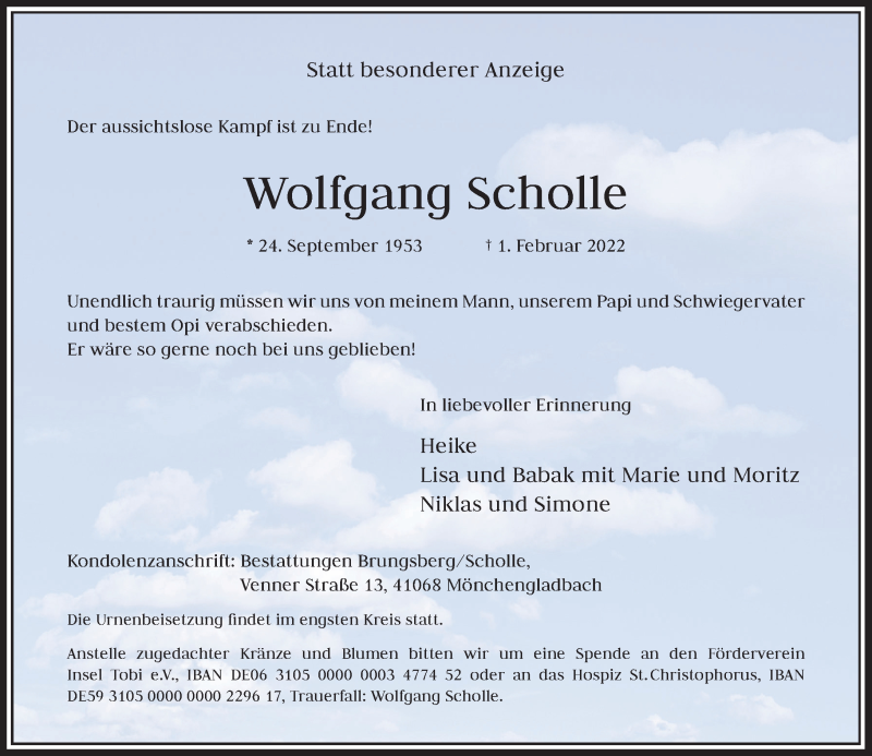 Hier finden Sie alle Traueranzeigen aus der Zeitung, die bisher für Wolfgang Scholle erschienen sind. Weitere Traueranzeigen, die in der Zeitung erscheinen, werden hier ebenfalls aufgelistet