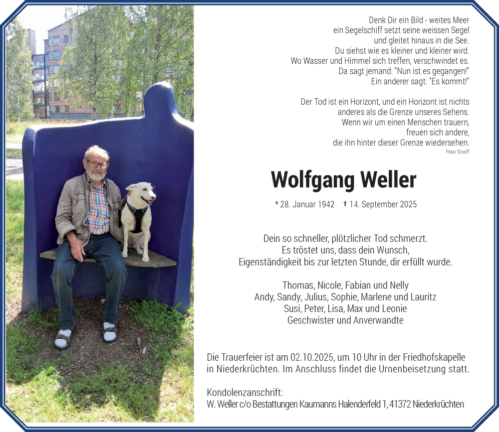 Hier finden Sie alle Traueranzeigen aus der Zeitung, die bisher für Wolfgang Weller erschienen sind. Weitere Traueranzeigen, die in der Zeitung erscheinen, werden hier ebenfalls aufgelistet